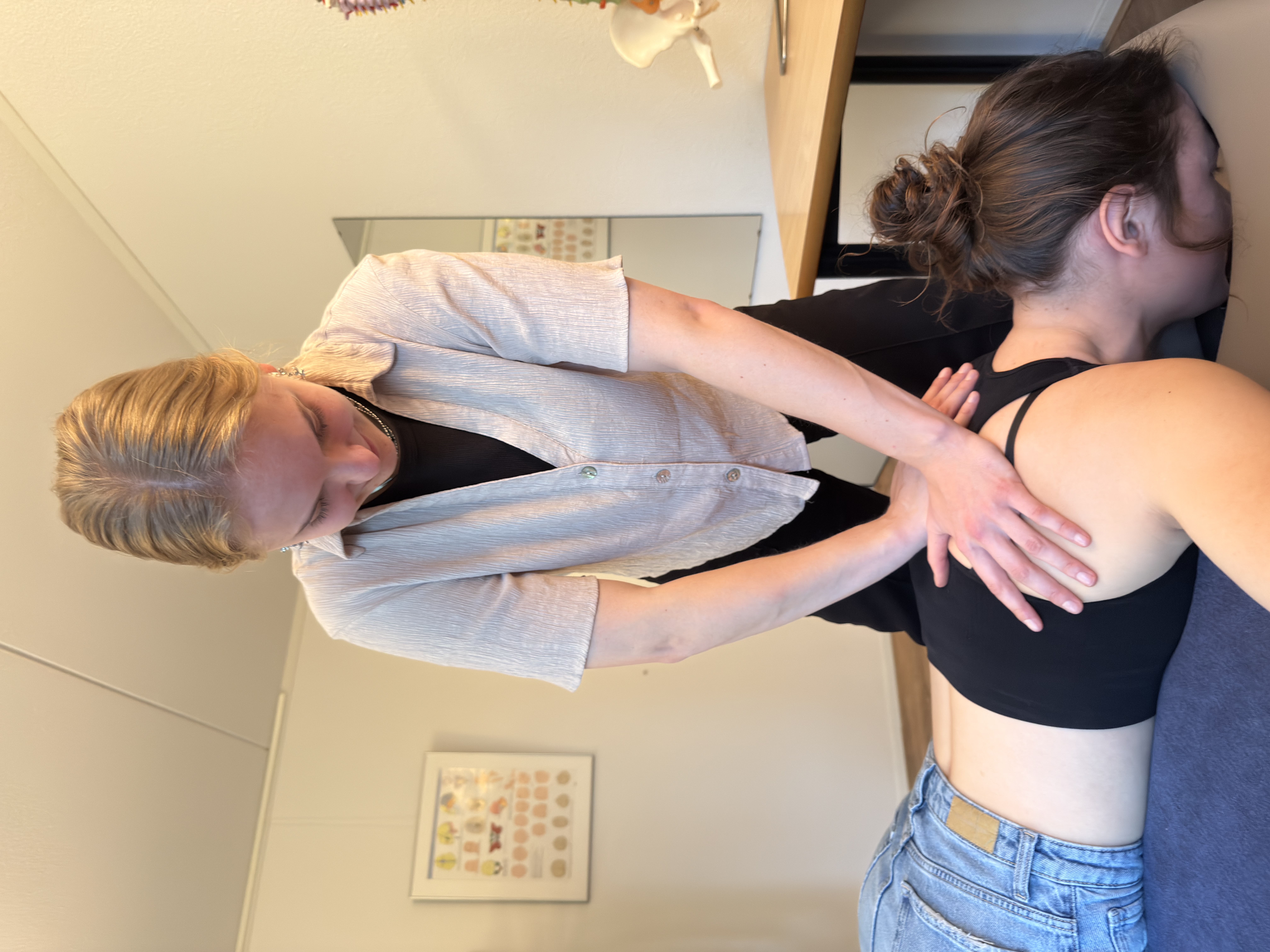 Na het gesprek volgt het lichamelijk onderzoek. We onderzoeken het lichaam van top tot teen op bewegelijkheid van gewrichten, spieren, organen en andere weefsels. Het lichaam wordt altijd in zijn geheel bekeken, zodat we verbanden tussen verschillende regio’s kunnen herkennen.