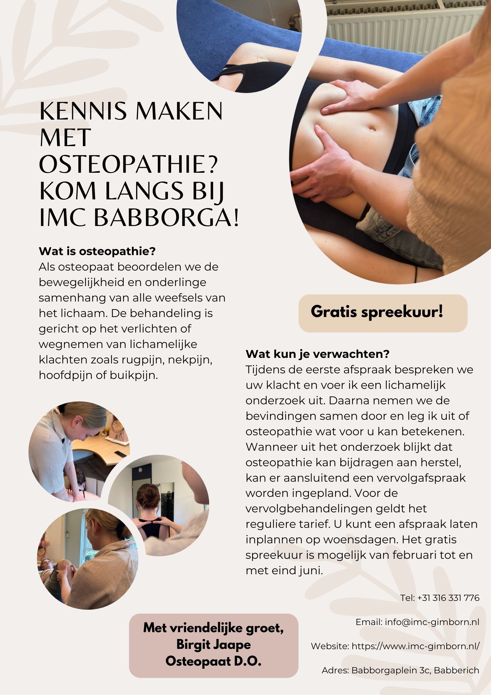 Wil je graag kennismaken met osteopathie en ontdekken wat het voor jou kan betekenen? Dan ben je van harte welkom op mijn gratis osteopathisch spreekuur in Babberich.